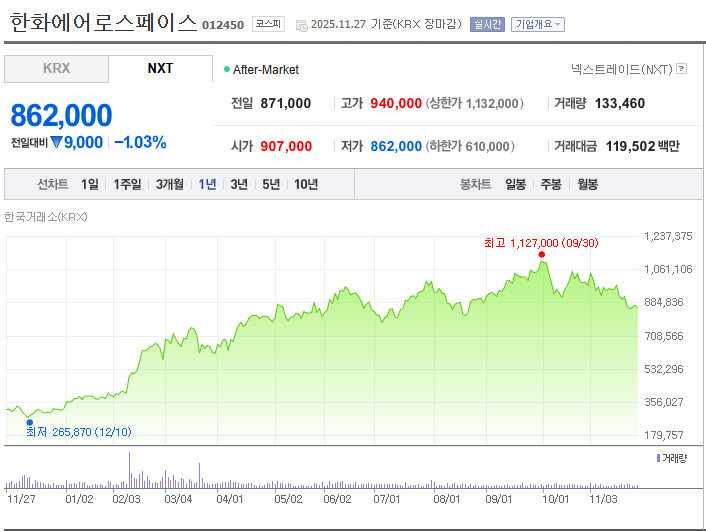 📊 한화에어로스페이스 주가 현황 (2025년 11월 27일 기준)