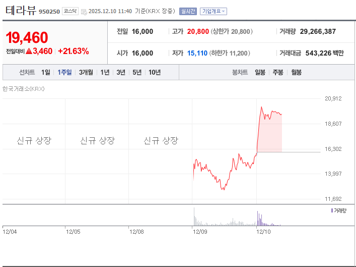 테라뷰는 상장 첫날 시초가 12,000원으로 출발했습니다. 장중 최고 15,500원까지 치솟으며 투자자들의 뜨거운 관심을 받았고, 결국 종가 16,000원으로 마감했습니다.