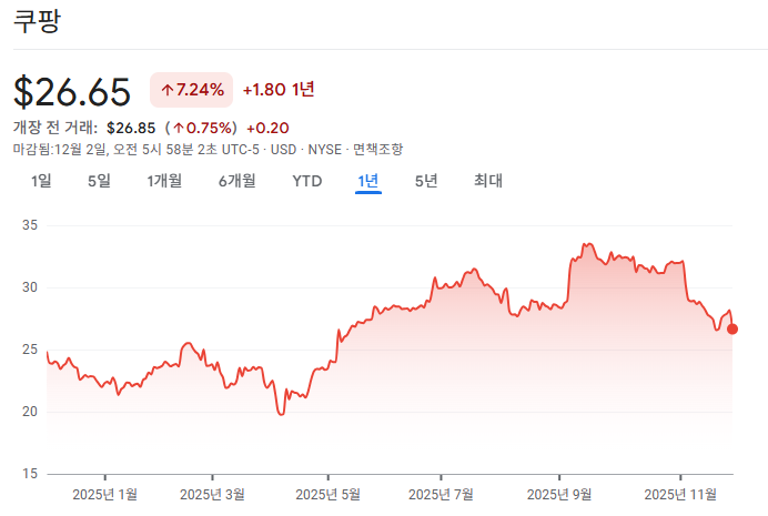 쿠팡 주가는 2025년 들어 52주 최고가인 34.07달러까지 치솟으며 연초 대비 50% 가까운 상승률을 기록했었습니다. 하지만 최근 조정을 거치며 현재는 52주 범위(19.02~34.07달러)의 중하단에 위치하고 있습니다.